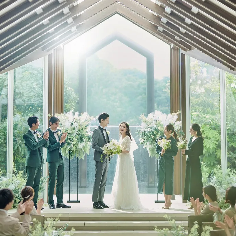横浜みなとみらいでは珍しい、【緑・水・光】が溢れるガラス張りのチャペル!お二人の背景には緑が広がり、自然の光がお二人を照らす神秘的な教会。祭壇に流れる滝を眺めながら胸に刻まれる感動の誓いを体験できる。
