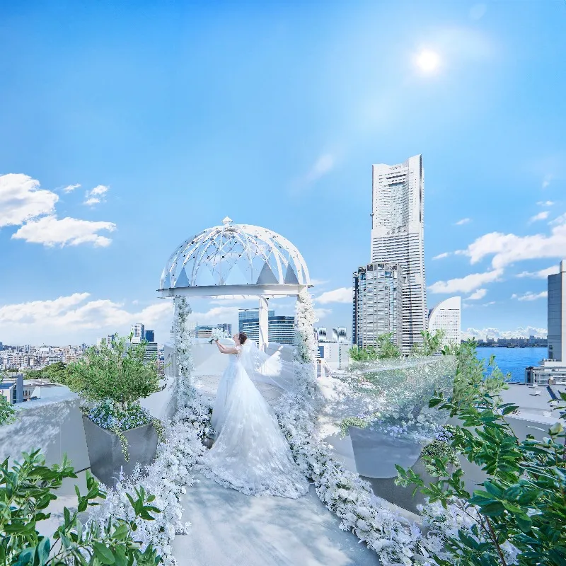 横浜みなとみらいでは珍しい、【緑・水・光】が溢れるガラス張りのチャペル!お二人の背景には緑が広がり、自然の光がお二人を照らす神秘的な教会。祭壇に流れる滝を眺めながら胸に刻まれる感動の誓いを体験できる。